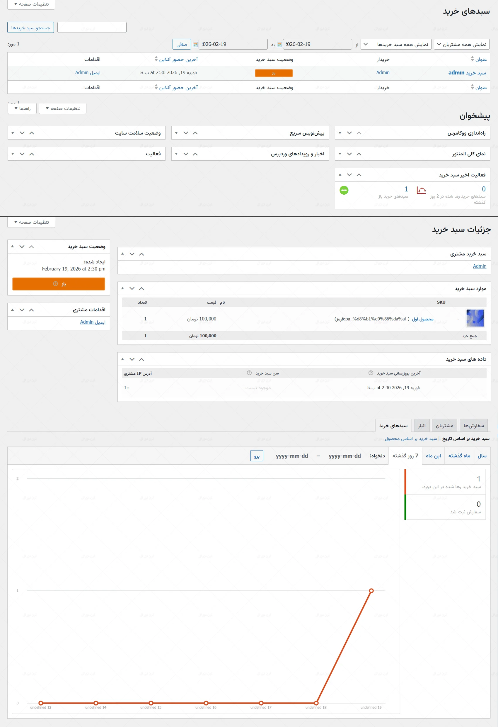 گزارش های سبد خرید همچنین یک ابزارک پیشخوان ارائه میدهد که به مدیران، نگاهی سریع به روند سبد خرید میدهد. سبدهای خرید باز و سبدهای خرید اخیراً رها شده را مستقیماً از پیشخوان ووکامرس مشاهده کنید.